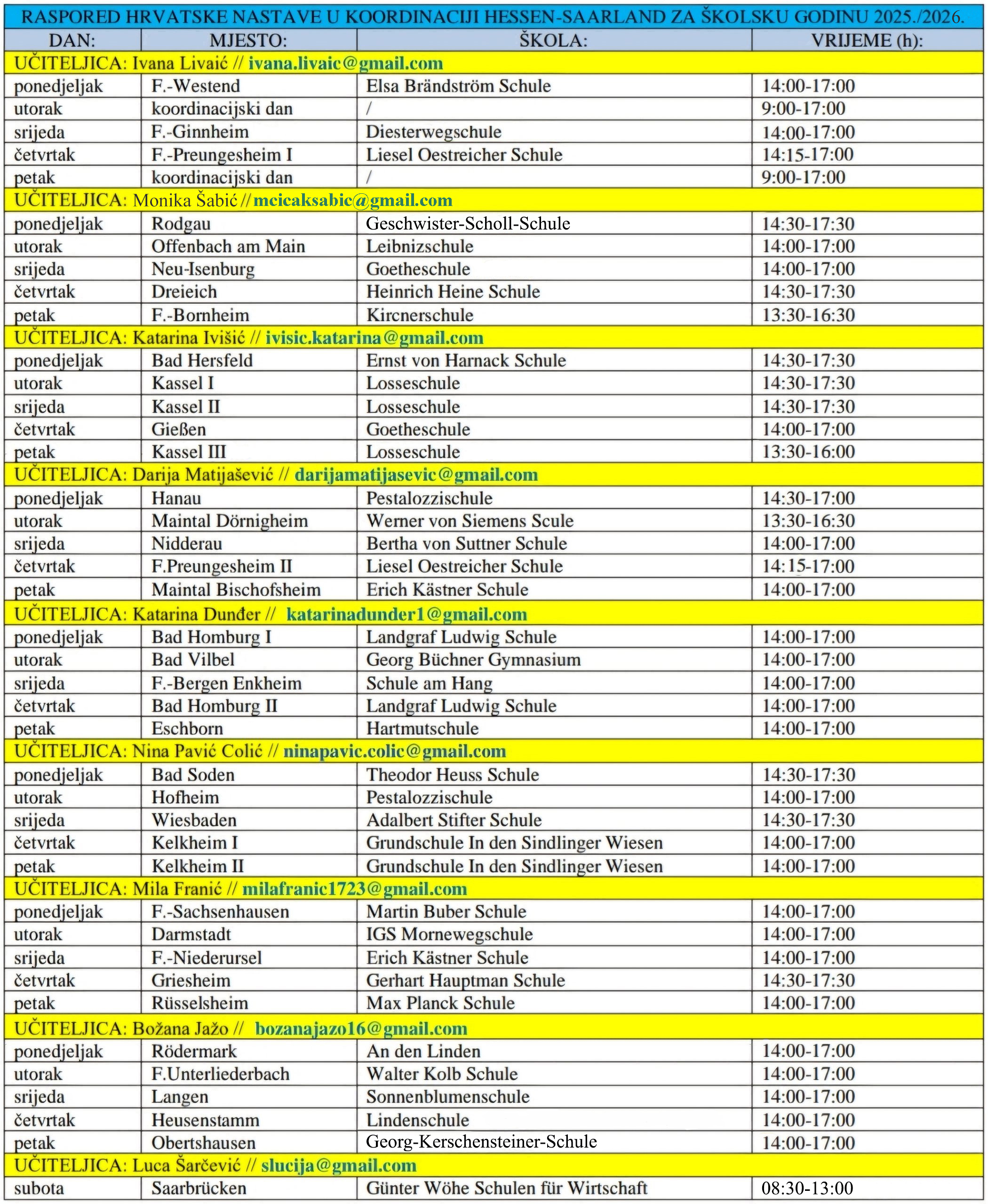 Nastava u mjestu Saarbrücken se subotom održava u tri nastavne skupine (od 8:30 do 10:00 sati, od 10:00 do 11:30 sati i od 11:30 do 13:00 sati)